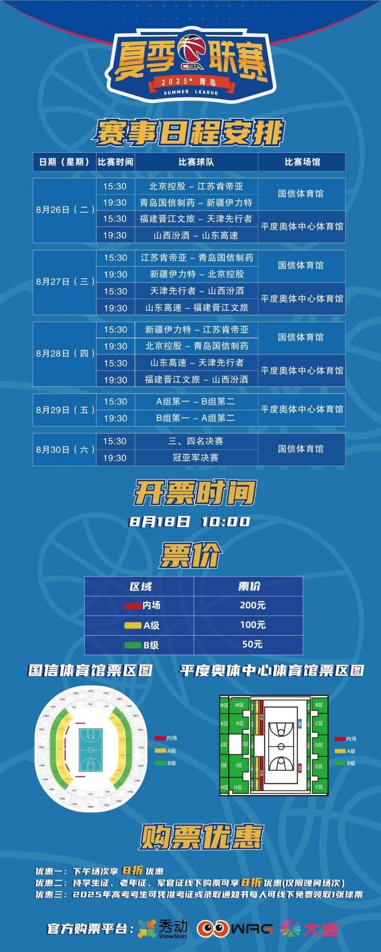 CBA夏季联赛青岛站的具体安排今天在2025年青岛篮球季启动仪式上正式公布!小组赛分为A、B组,A组的新疆、青岛、北控、江苏分在青岛国信体育馆;B组的山西、山东、天津和福建则在平度奥体中心体育馆。赛程为5天(8月26日至8月30日),每个场馆每天2场比赛,所有白天场次门票打八折。