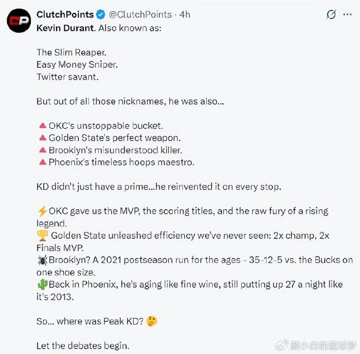 美媒更是写道,人们对杜兰特离开雷霆后的生涯有些误解,他在雷霆就已经是MVP+得分王,去了勇士后拿下二连冠+FMVP,在篮网他2021年险些击败巅峰扬尼斯只是因为鞋码差了一点,来到凤凰城他依旧能场均27分彷佛回到2013年那般。